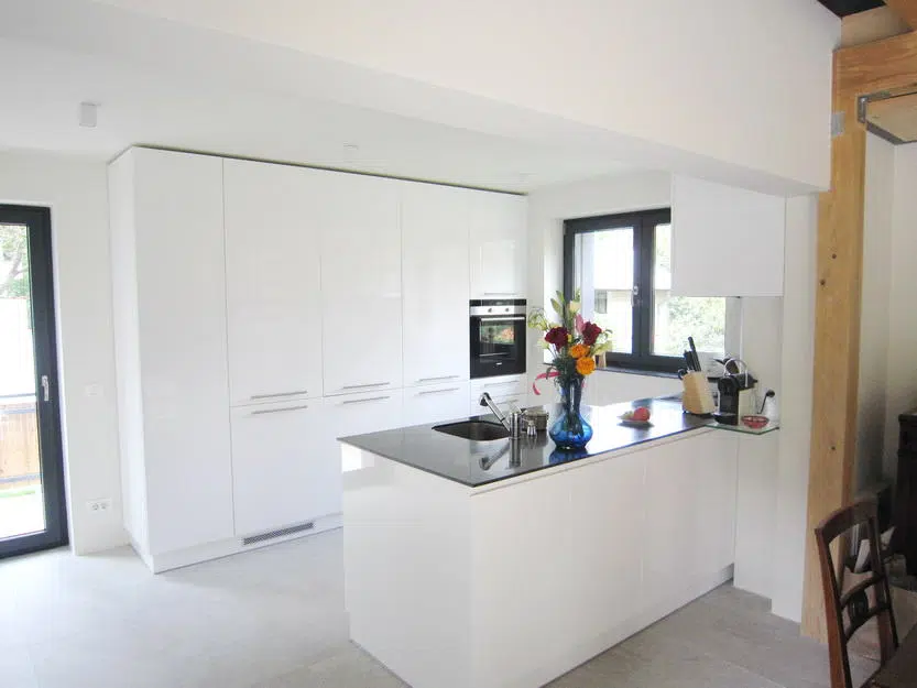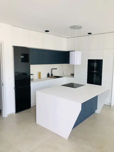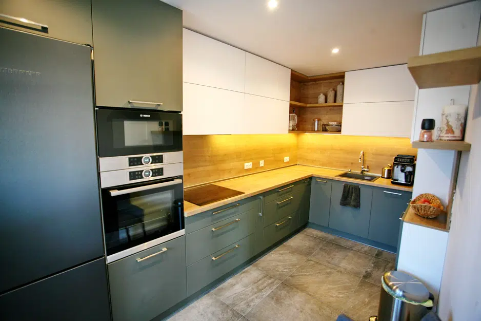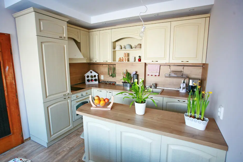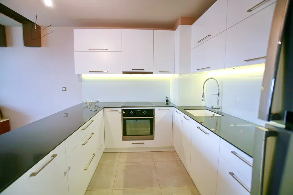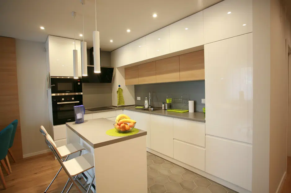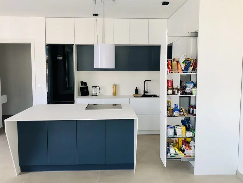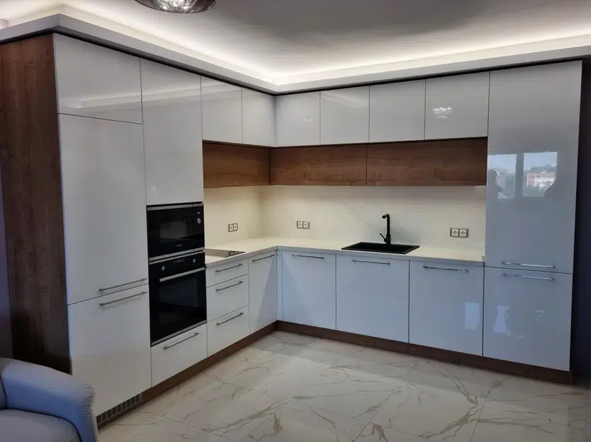 2.П-образна – популярно кухненско решение, което включва поставяне единици около три стени на помещението, което го прави идеално разположение за създаване на работен триъгълник. За да се увеличи максимално съхранение, помисли за включване на специализирани кухненски ъглови мепанизми създадена за трудните за достигане ъглите, които ще ви позволят да имат лесен достъп до потенциално мъртво пространство.