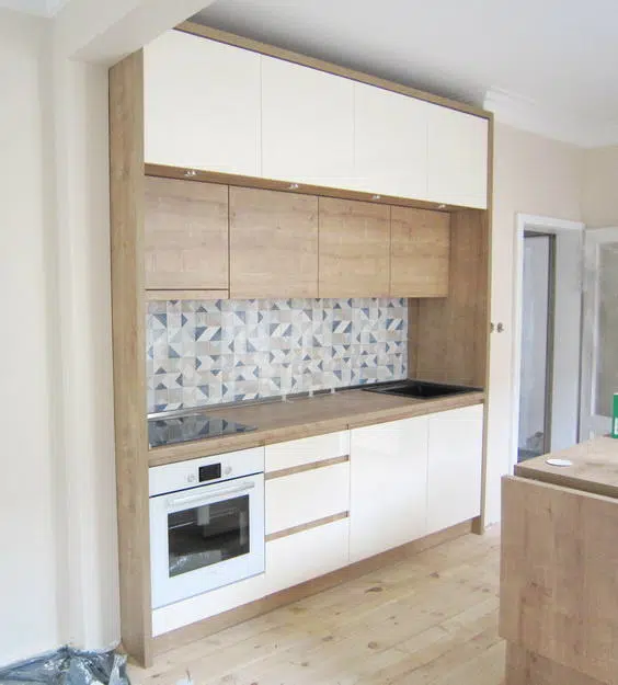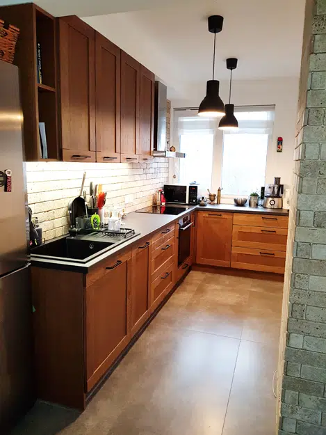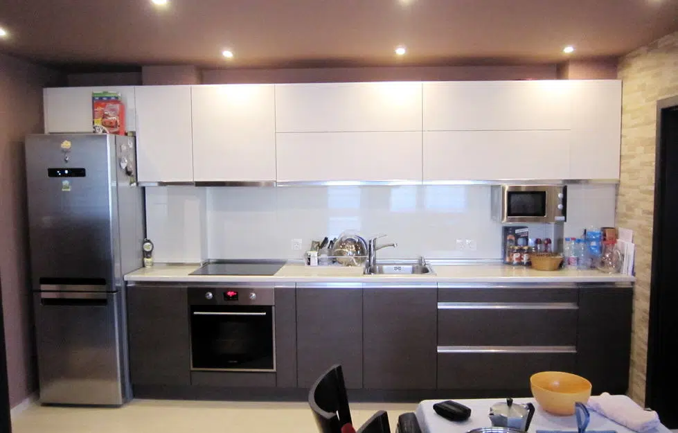 1.От двете страни – вариант за тясна стая. Отстоянието между двата реда т трябва да е мин 90-120см за да може свободно да използвате всички уреди и шкафове. Ако стандартните кухненски модули са прекалено широки, бихте могли да замени едната страна с по-тесни.