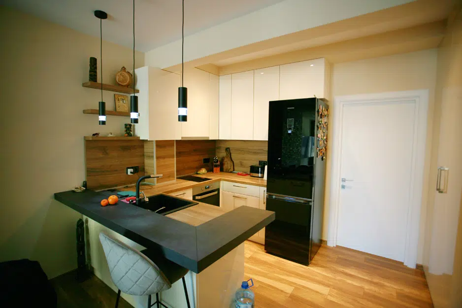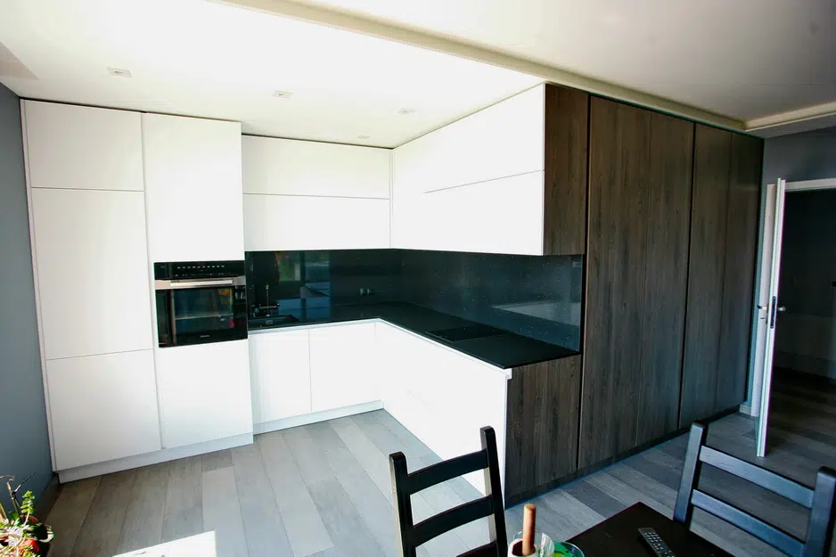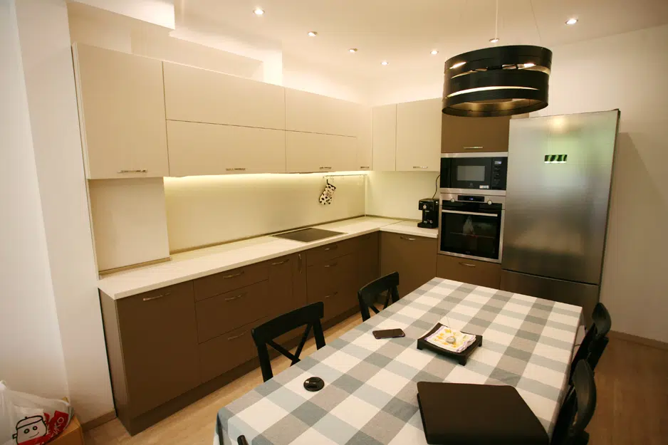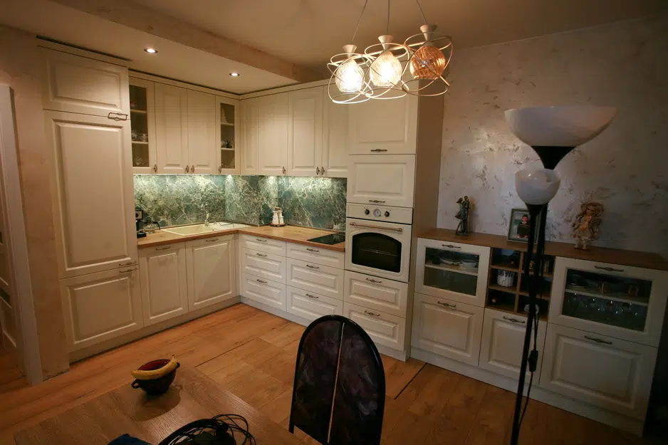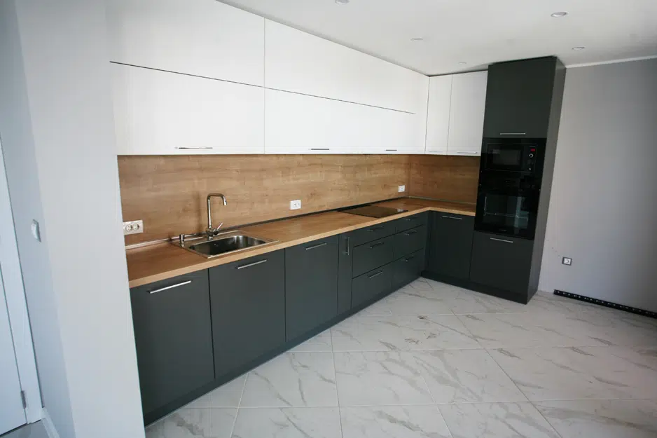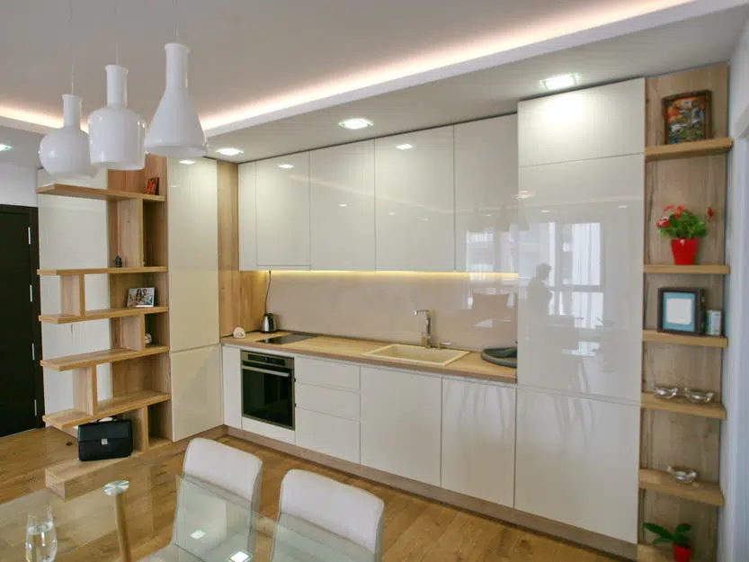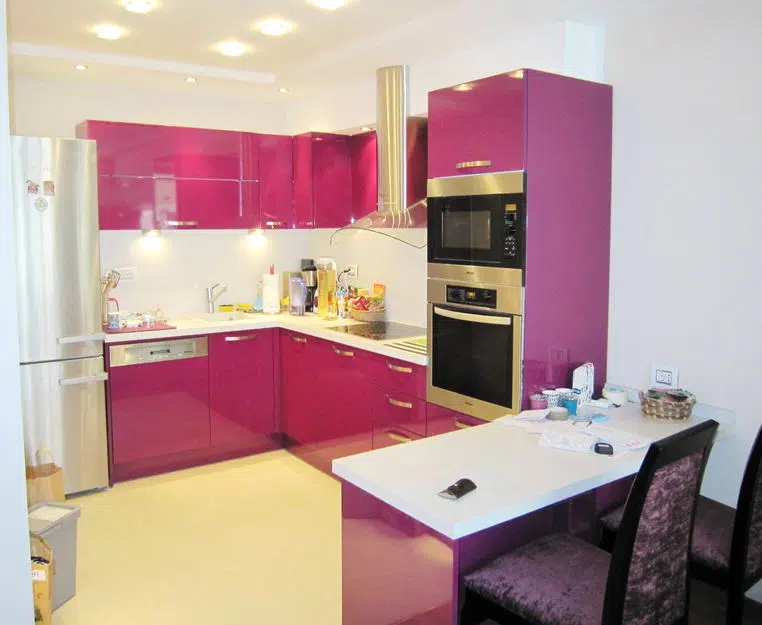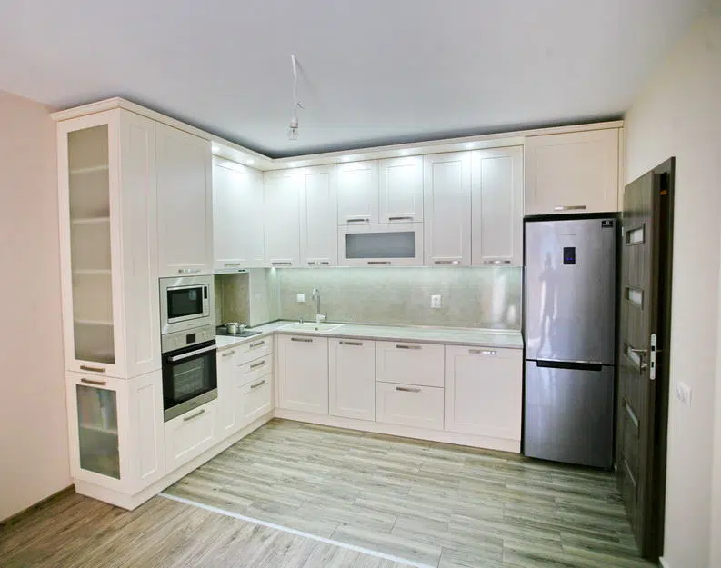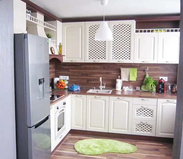 3.Г-образна – прост и практичен вариант, който включва поставяне на ред на кухненскишкафове в две съседни стени, за да създадете основна Г-образна форма. В останалата част на помещението остава подходящо място за трапезарна маса. За оптимално оформление, позиционирате вашата мивка на едната работна страна и вашия район готвене, от друга.