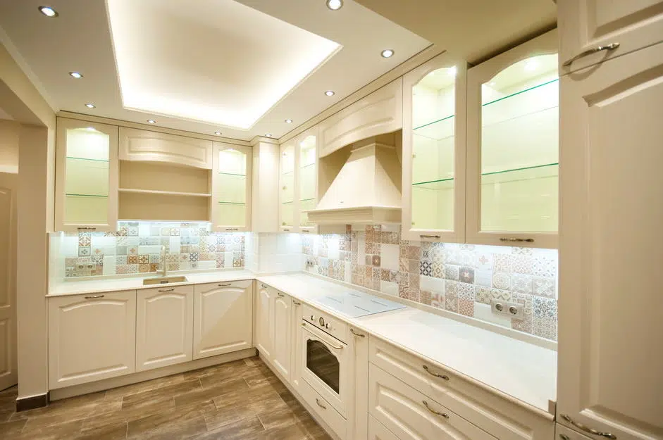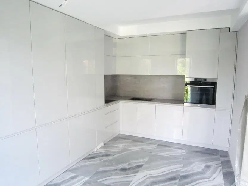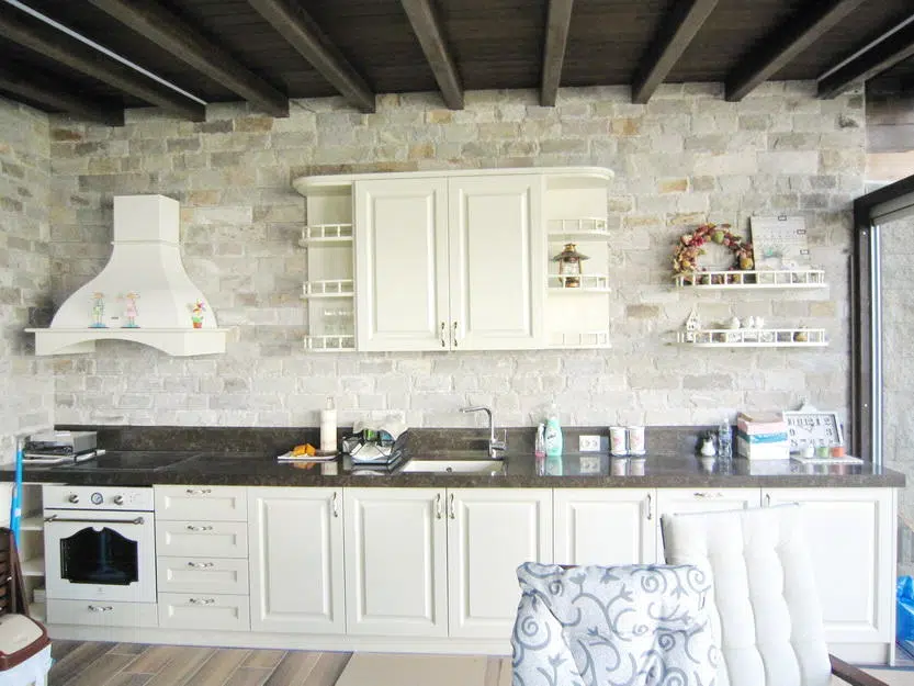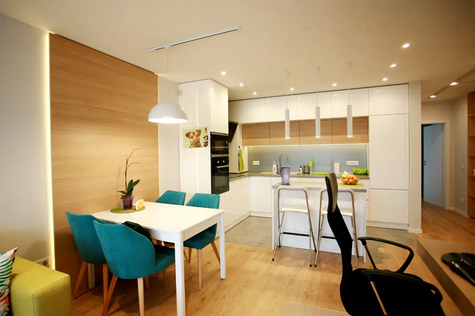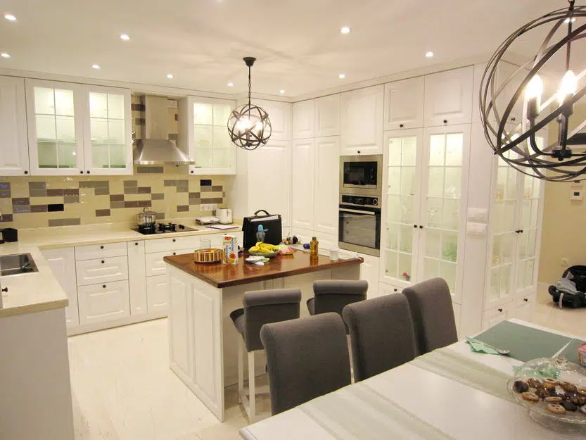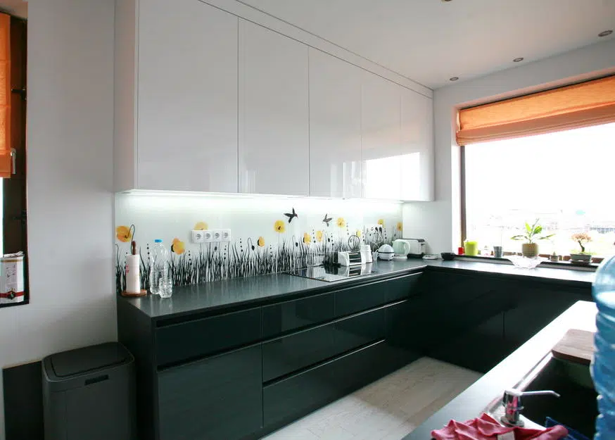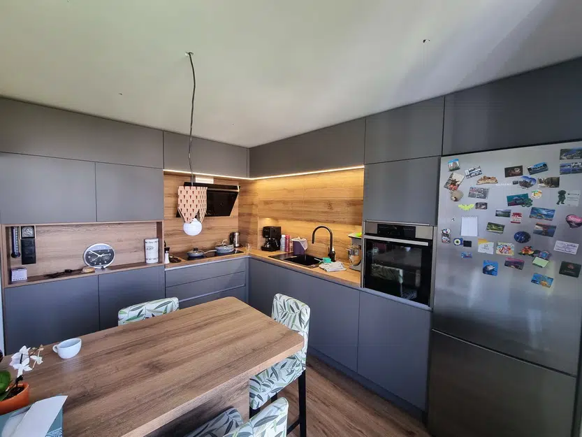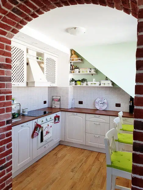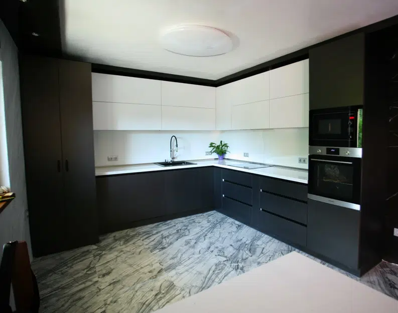3.Г-образна – прост и практичен вариант, който включва поставяне на ред на кухненскишкафове в две съседни стени, за да създадете основна Г-образна форма. В останалата част на помещението остава подходящо място за трапезарна маса. За оптимално оформление, позиционирате вашата мивка на едната работна страна и вашия район готвене, от друга.